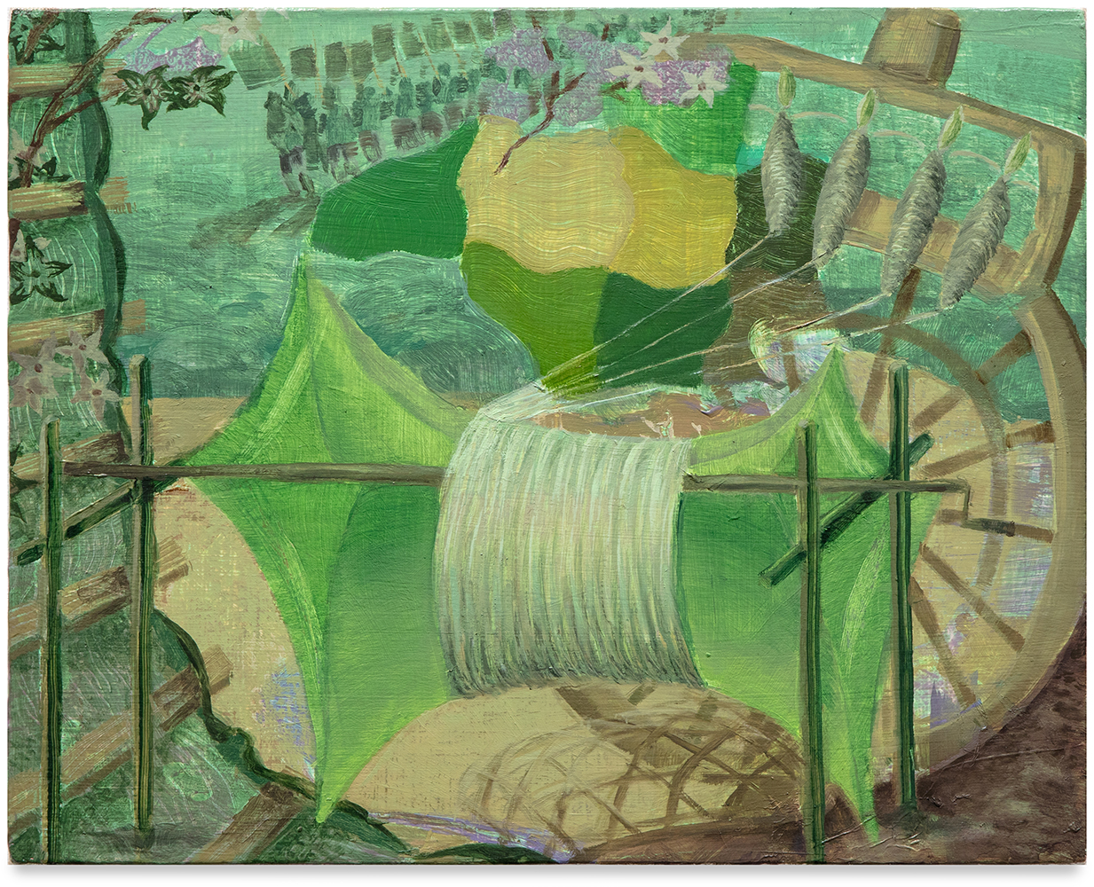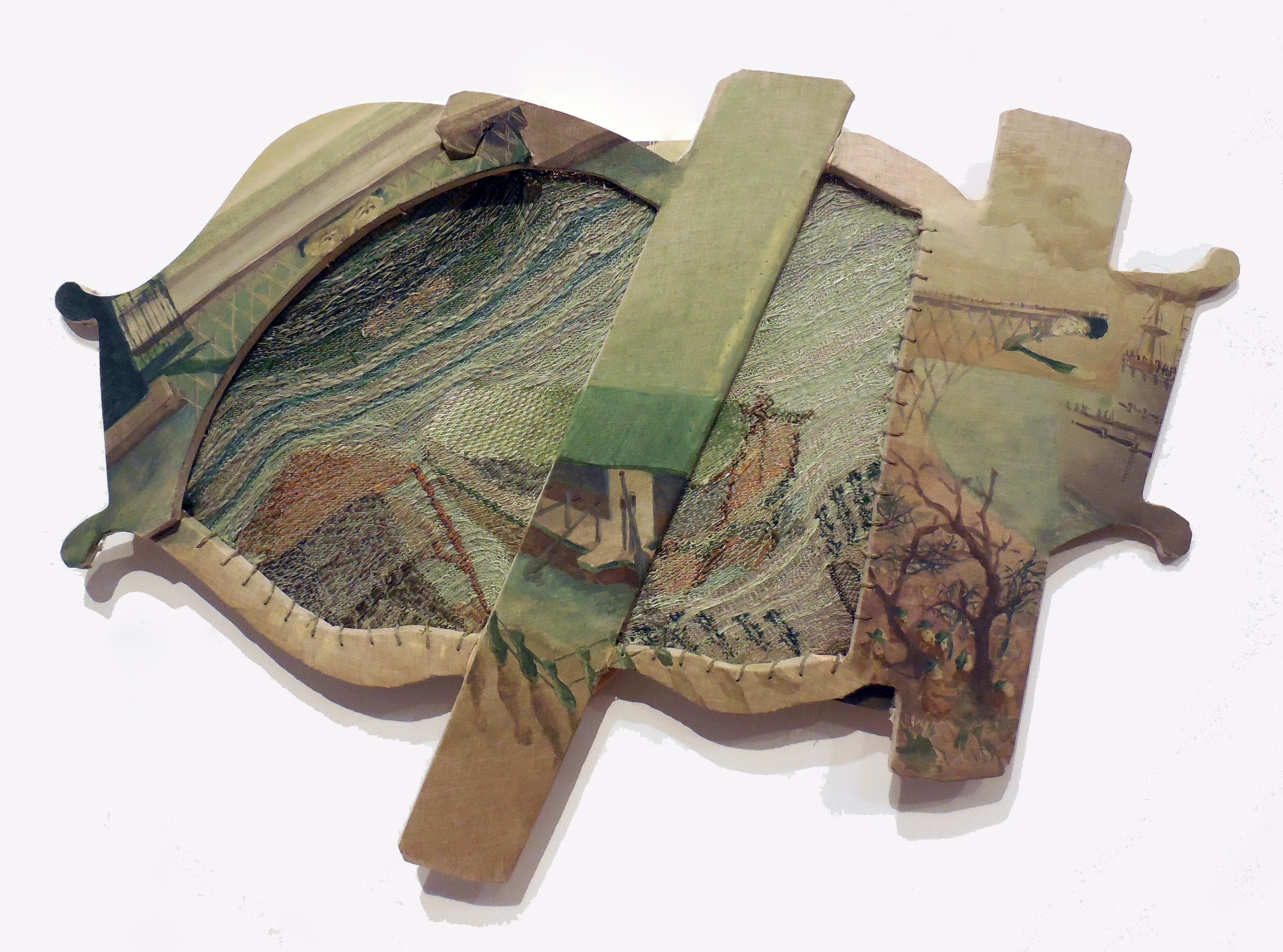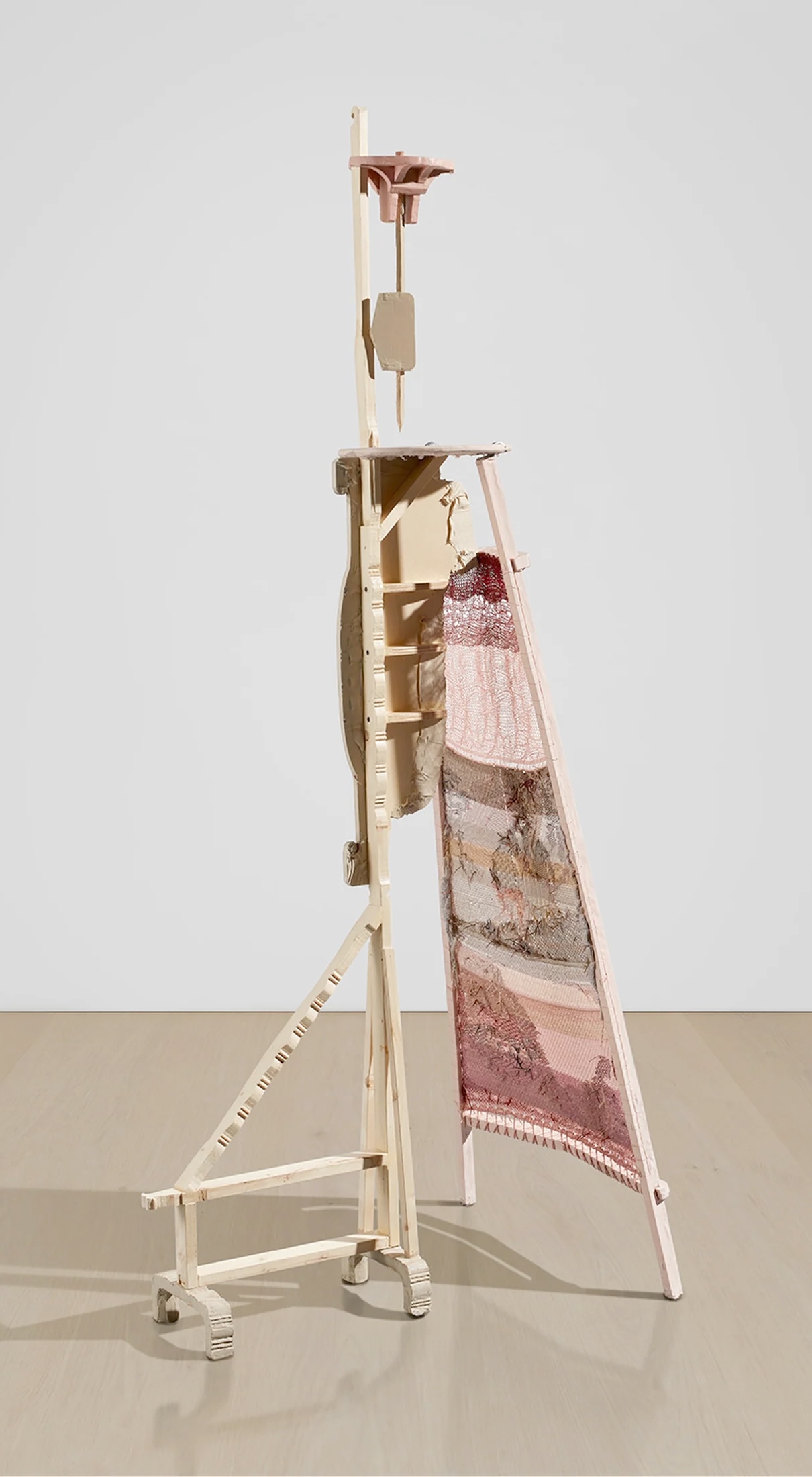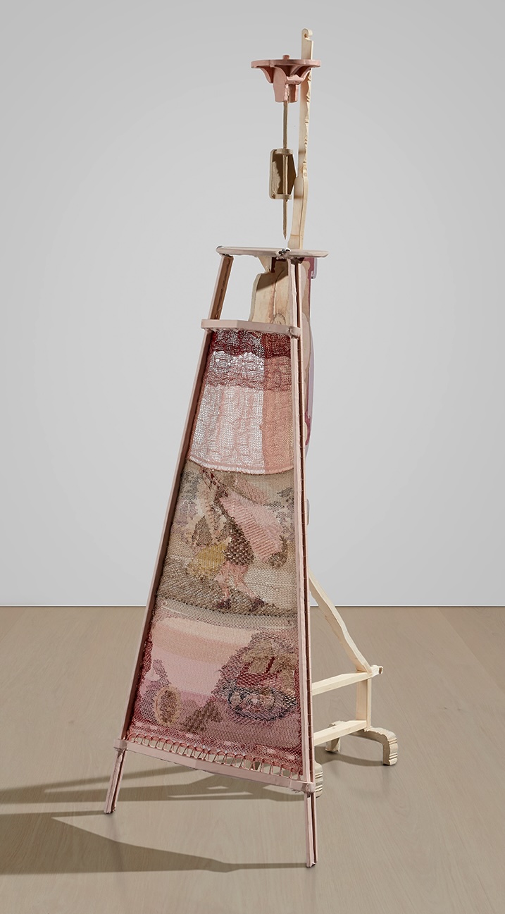 Gouache and acrylic on cotton fabric mounted to wood, machine-knit textile, steel hardware