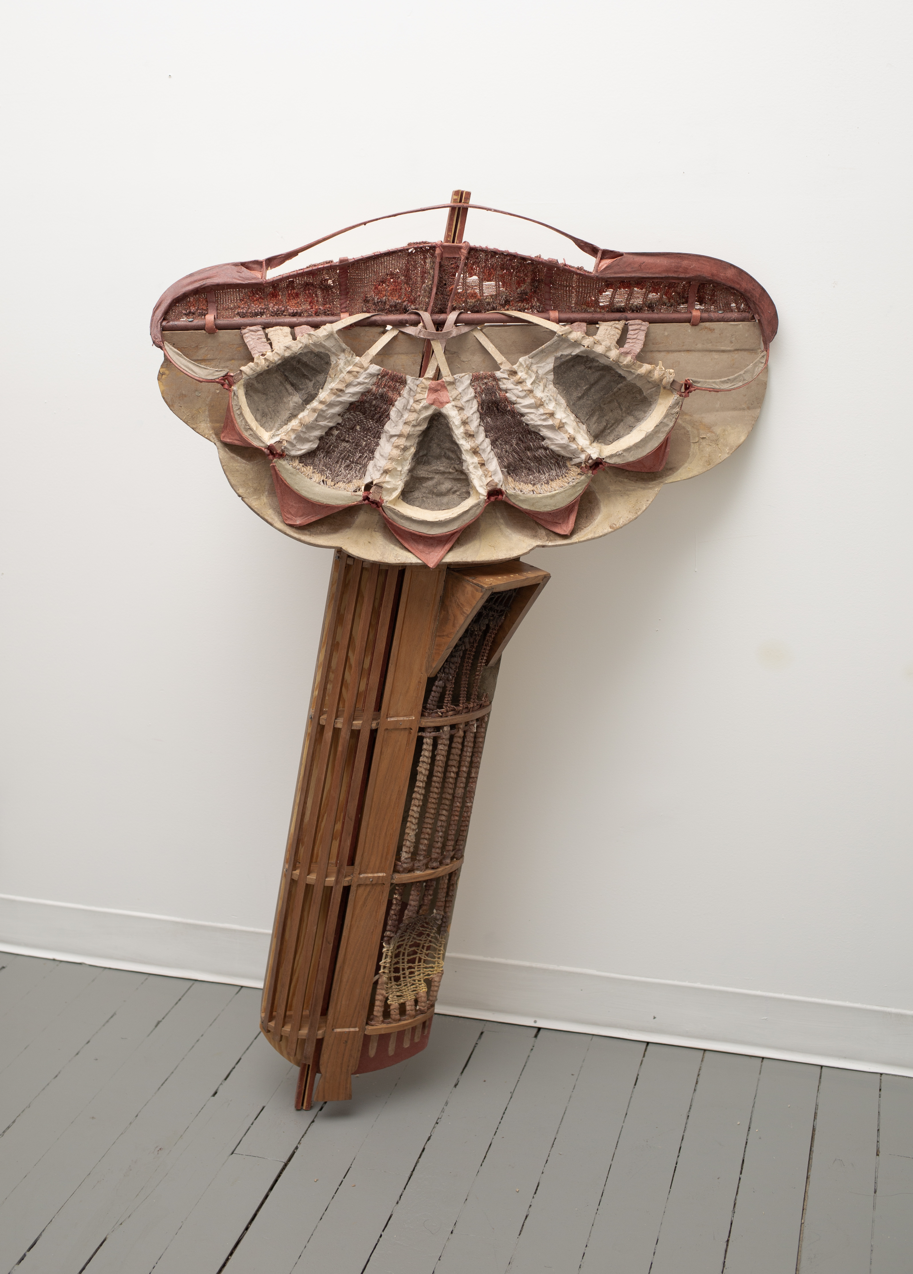 Rattan, abaca, black walnut, plywood, pigment dye, machine-knit and hand-woven textile, hardware
